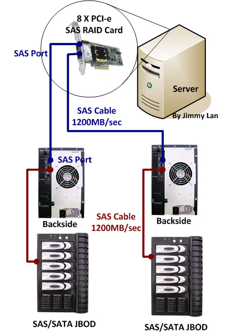 架構 : Server內部安裝8XPCI-e SAS RAID Card,透過SAS Cable連接至SAS/SATA JBOD。主機SAS通道可達1200MB/sec高傳輸速度。