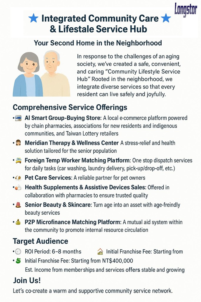 👵👴 面對高齡化社會的挑戰,我們打造一個兼具健康、便利與關懷的「安心生活服務站」,以社區為基礎,整合多元服務,讓每一位居民都能安心生活、自在樂活。