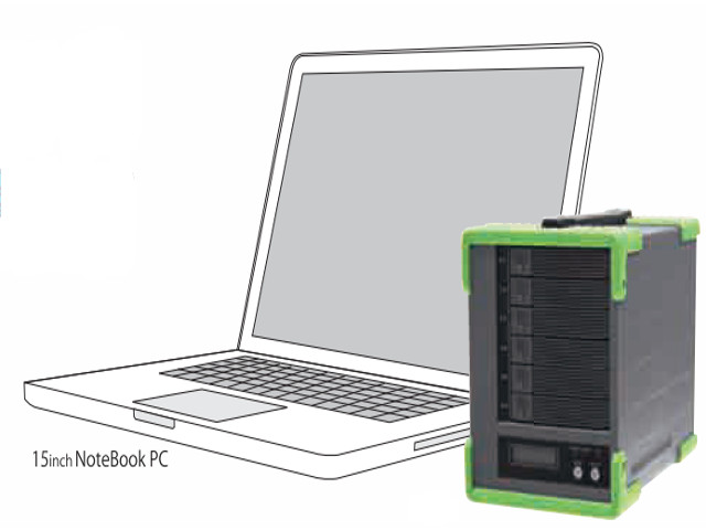 Enclosed by metal wrapped rubber protectors, the system is designed to protect itself from shock and vibration during transportation or operation. Large capacity video data can be carried to any place for editing and broadcasting.